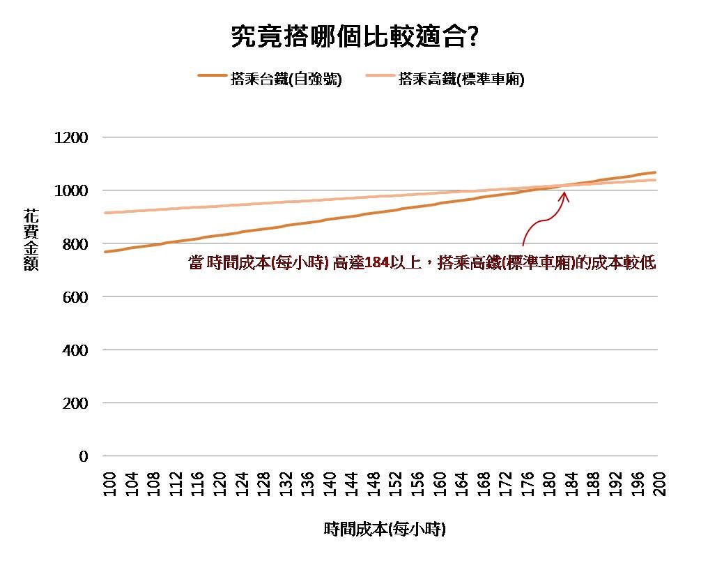 >>換句話說,如果個人的時間成本超過184元/小時,那麼選擇搭乘高鐵(標準車廂)的成本相對較低。#